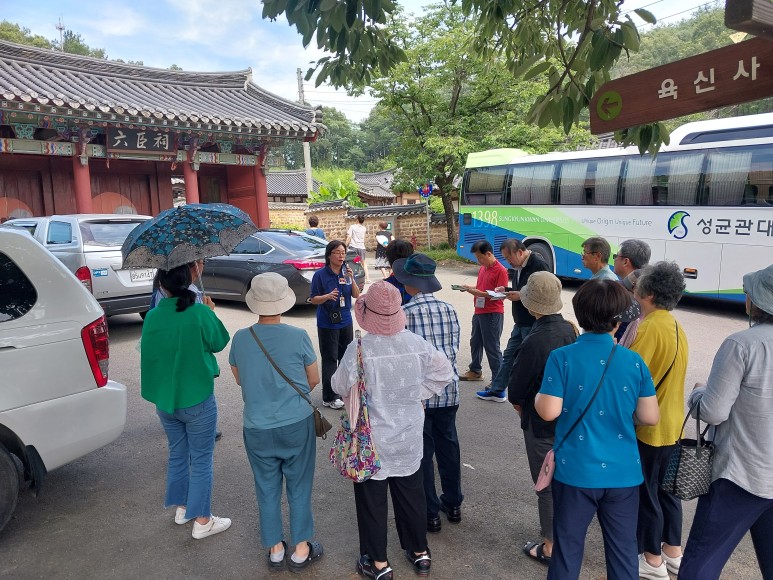 해설사님에게 육신사에 대해서 설명을 듣고 있다.